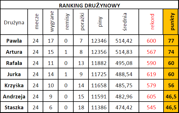 W dniu 14 grudnia 2017 roku odbyły się czwarte rozgrywki "Drużynowej Czechowickiej Ligi Bowlingowej - jesień 2017". Na jedną kolejkę przed końcem rozgrywek na fotel lidera wysunęła się drużyna PAWŁA, która o trzy punkty wyprzedza drużynę ARTURA. O zajęcie miejsce na podium do końca walczyć będą jeszcze drużyny RAFAŁA, JURKA i KRZYŚKA. Ozdobą tej kolejki był pojedynek Rafała z Pawłem (255-227), życiówka Sławka (244), oraz wygrana Aliny z Pawłem (177-168). Warto podkreślić że podczas tych rozgrywek padły 23 dwusetki. Przypominamy że ostatnie spotkanie tej edycji ligi odbędzie się 18 stycznia 2018 roku.